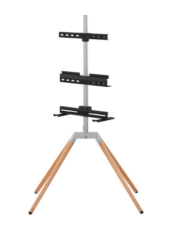 TV-stander tilbyder 360° drej, højdejustering, understøttelse af 32-70″ TV, VESA-kompatibilitet op til 400 x 400, integreret kabelstyring og et universelt soundbar-beslag.ONEFORALL WM7476 er en moderne gulvstander i eg og sølvgrå, designet til at hol